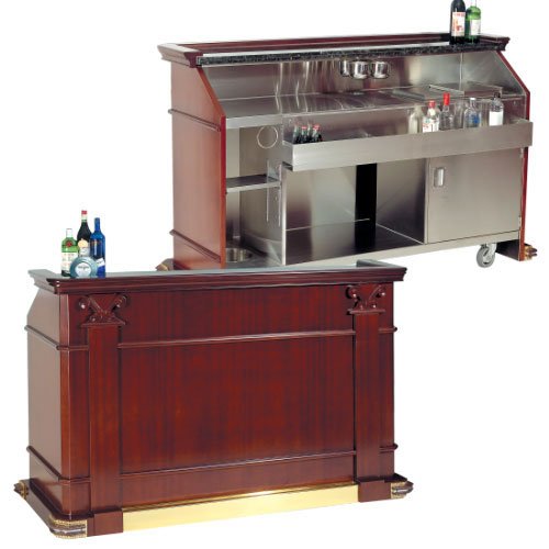 #Features: Heavy-duty casters, Adjustable shelves, 22" insulated ice bin, Stainless steel surface, Dispensing gun in lieu of sink, Solid brass trim with bumpers.