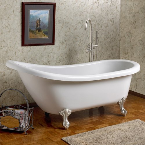 59" Victorian Acrylic Slipper Clawfoot Tub (Brushed Nickel Feet / No Tap Holes)?This elegant 59 Slipper Tub is ideal for baths with limited space. It features an extended gentle slope backrest and sits on Victorian ball and claw feet made of solid brass. Available without holes for use with a freestanding tub filler or faucet mounted on the bathroom wall. Tub Dimensions: 59 L x 29 W (front to back) x 23 - 32 H (± 1/2 ). Substantial and heavy tub; no creaking or stretching. Choice of Chrome, Polished Brass, Brushed Nickel, Oil Rubbed Bronze or White feet. Solid brass cast feet have built-in adjusters for use on uneven floors. Tub water capacity: 32 gallons Tub Weight Uncrated: 174 lbs. Tub Weight Crated: 399 lbs. Tubs are delivered by truck, to your residence, to your curb. The trucking company will call ahead to confirm delivery with you. Includes crate charge, shipping, and lift gate service.