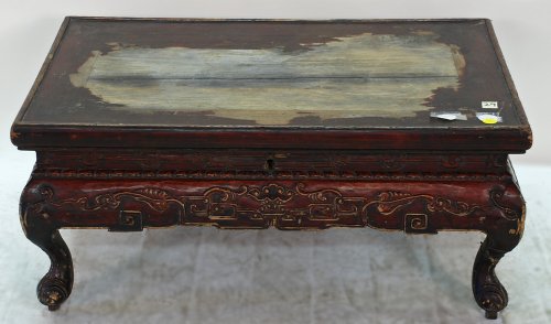 | RB1029X-Chinese Kang Table with Lift Top, circa 1825-1850, Shanxi Province China, Mixed Woods, Antiq #Antique Kang Table Chinese (Chinese Kang Table with Lift Top). A very interesting kang table due the fact that is opens-a museum quality piece. This antique waisted kang table's apron is beautifully carved with floral patterns and cabriole legs which rest in small lotus pads.